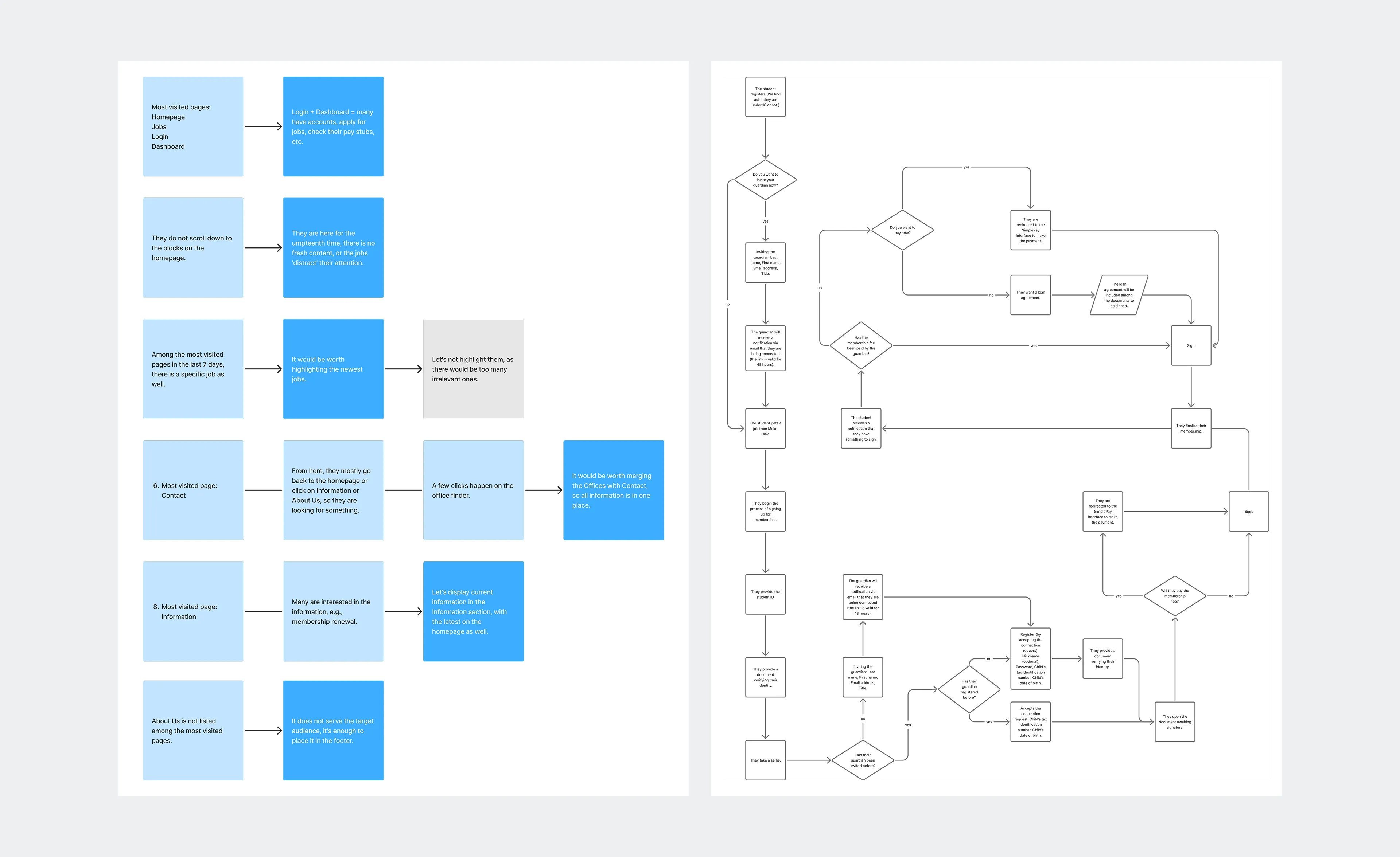 After researching and analyzing how students used the website, I collected and sorted out the insights, created a sitemap for the new version, along with user flows, including the membership registration process.