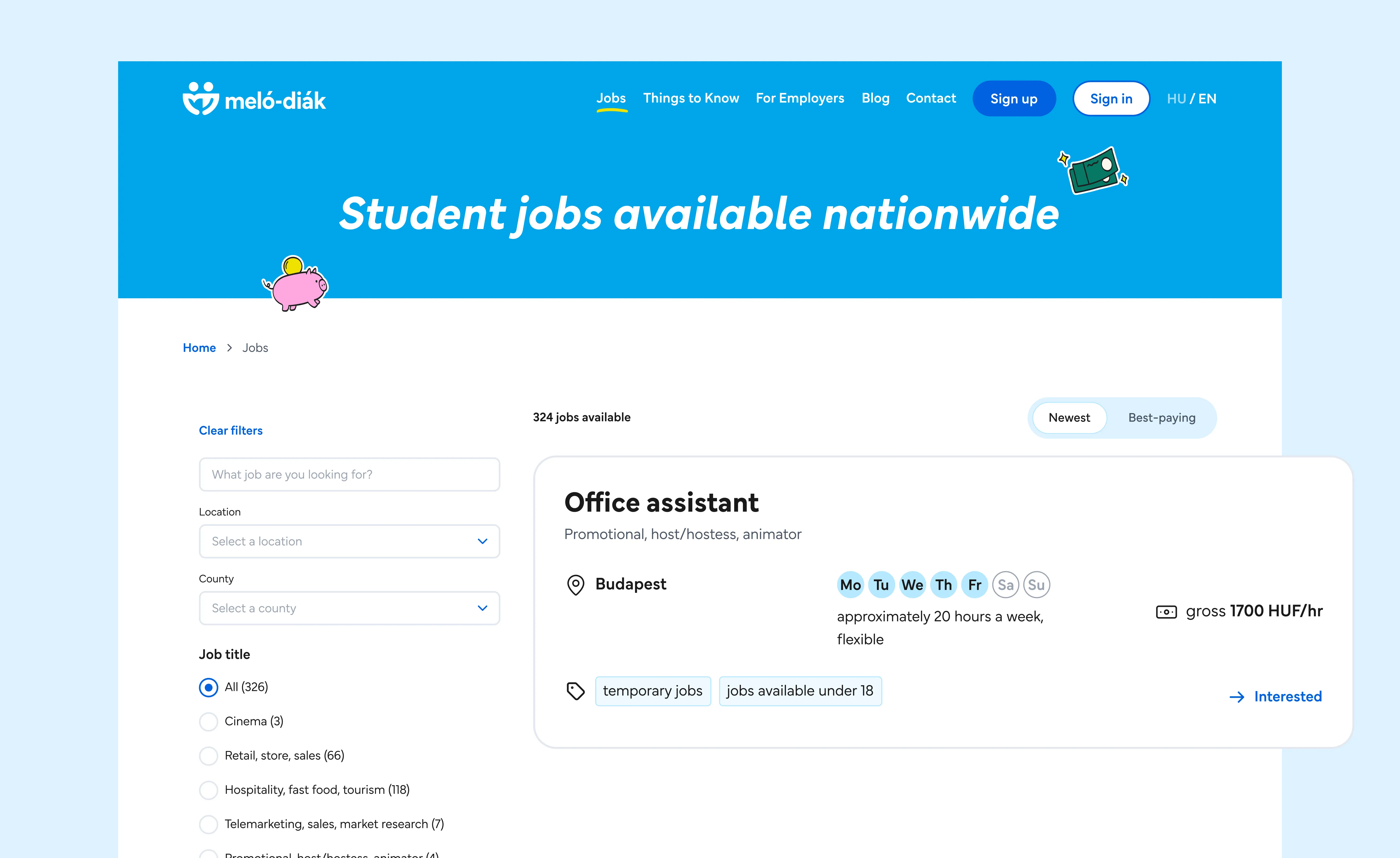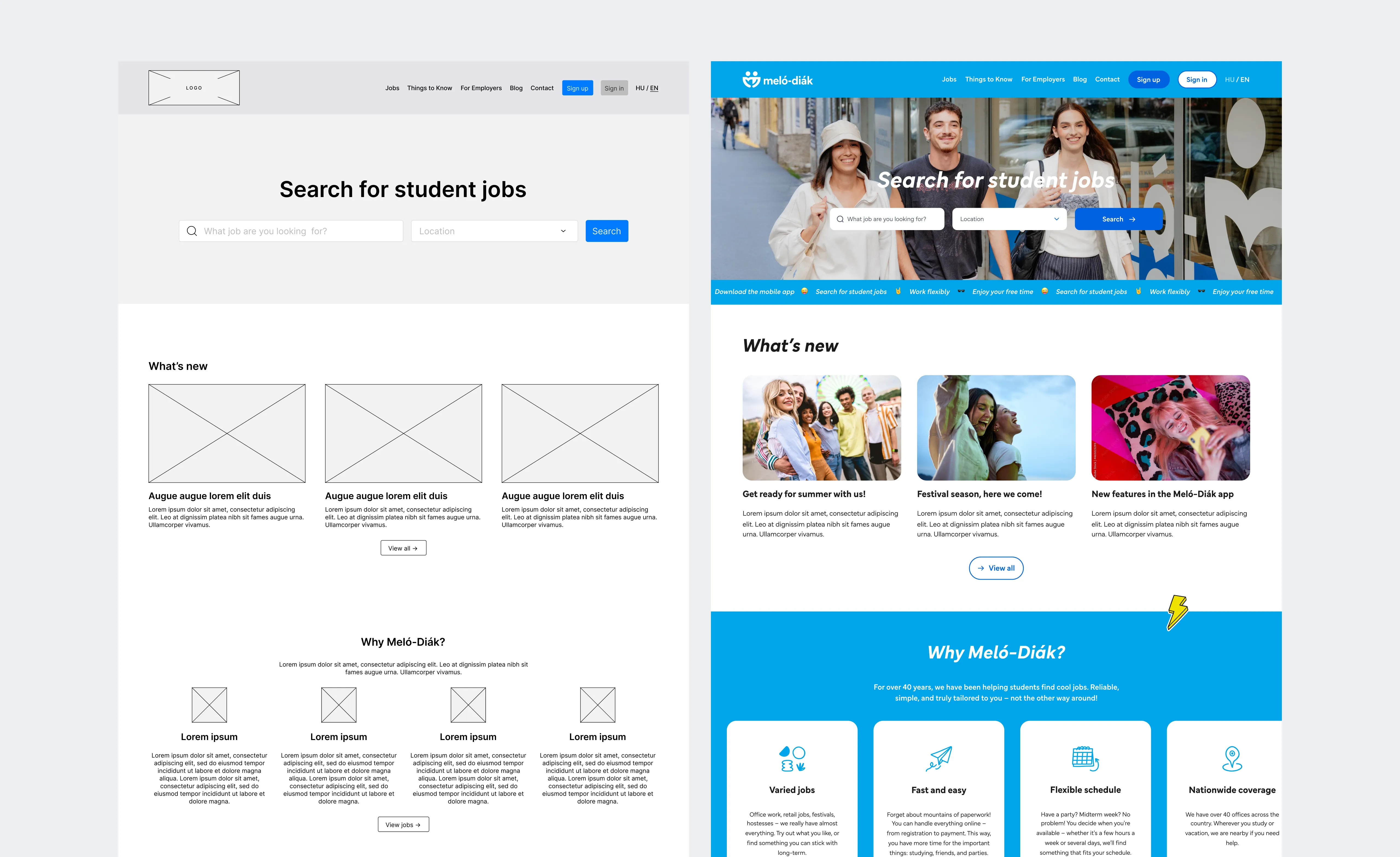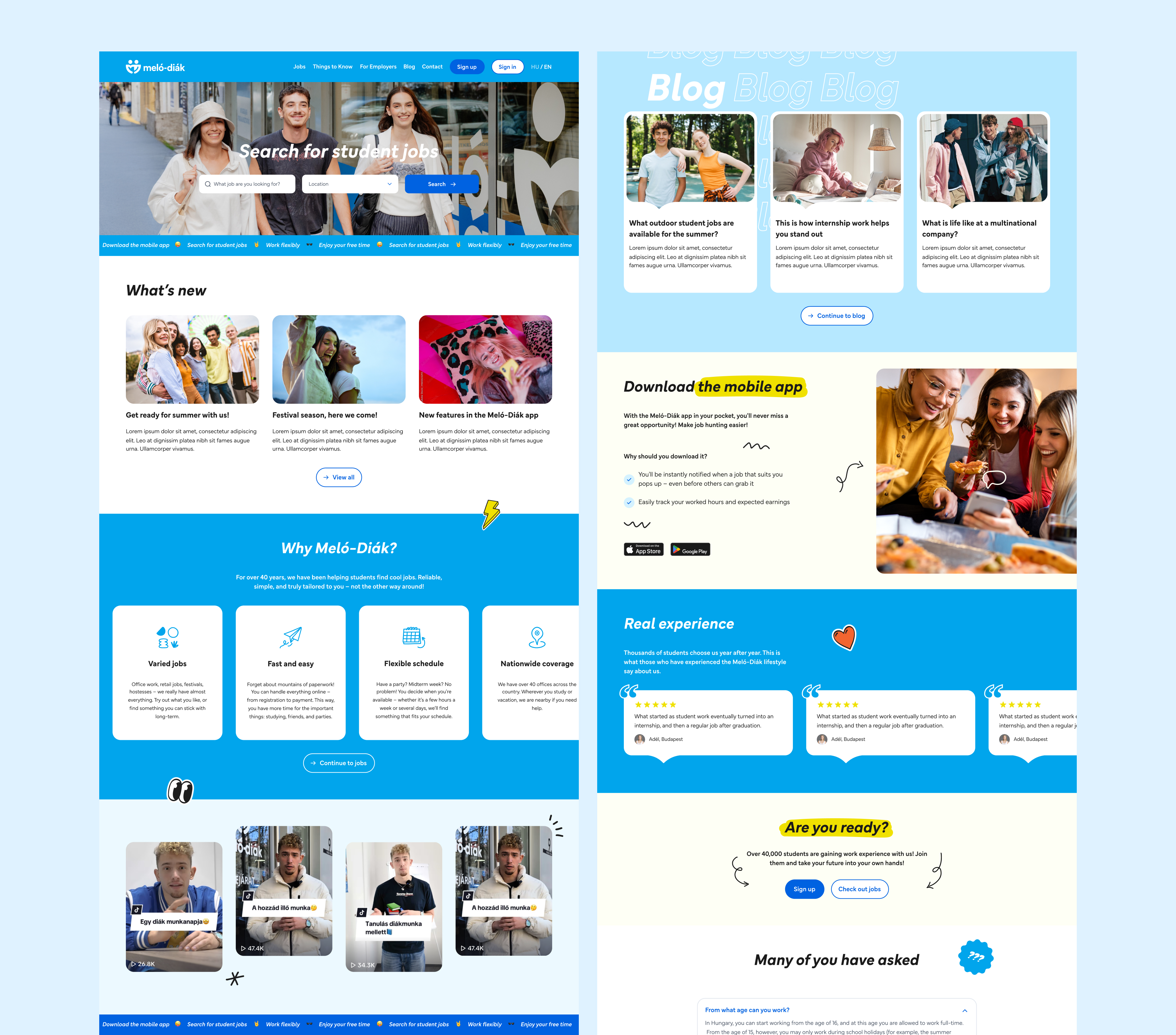 Meló-Diák is Hungary's largest and oldest student jobs portal with 40,000 active members. To stay relevant for a new generation of students (Gen Z), both its brand identity and web application needed a refresh. It's currently in development.