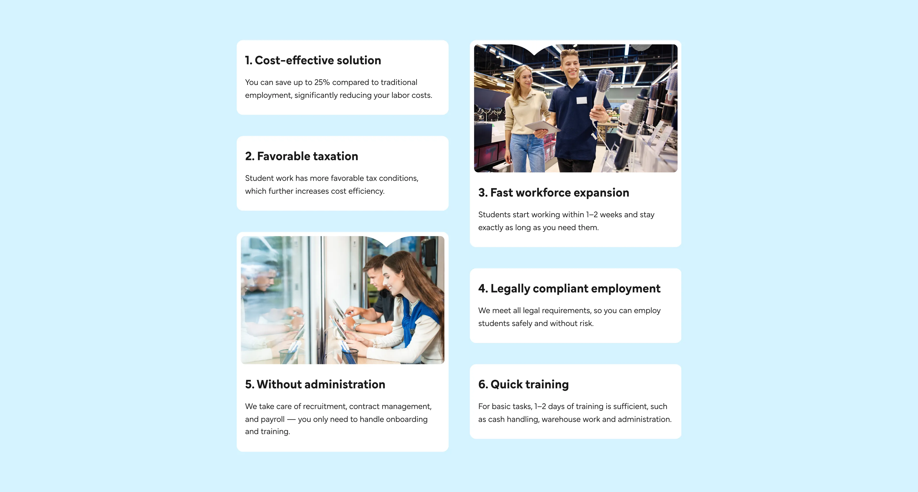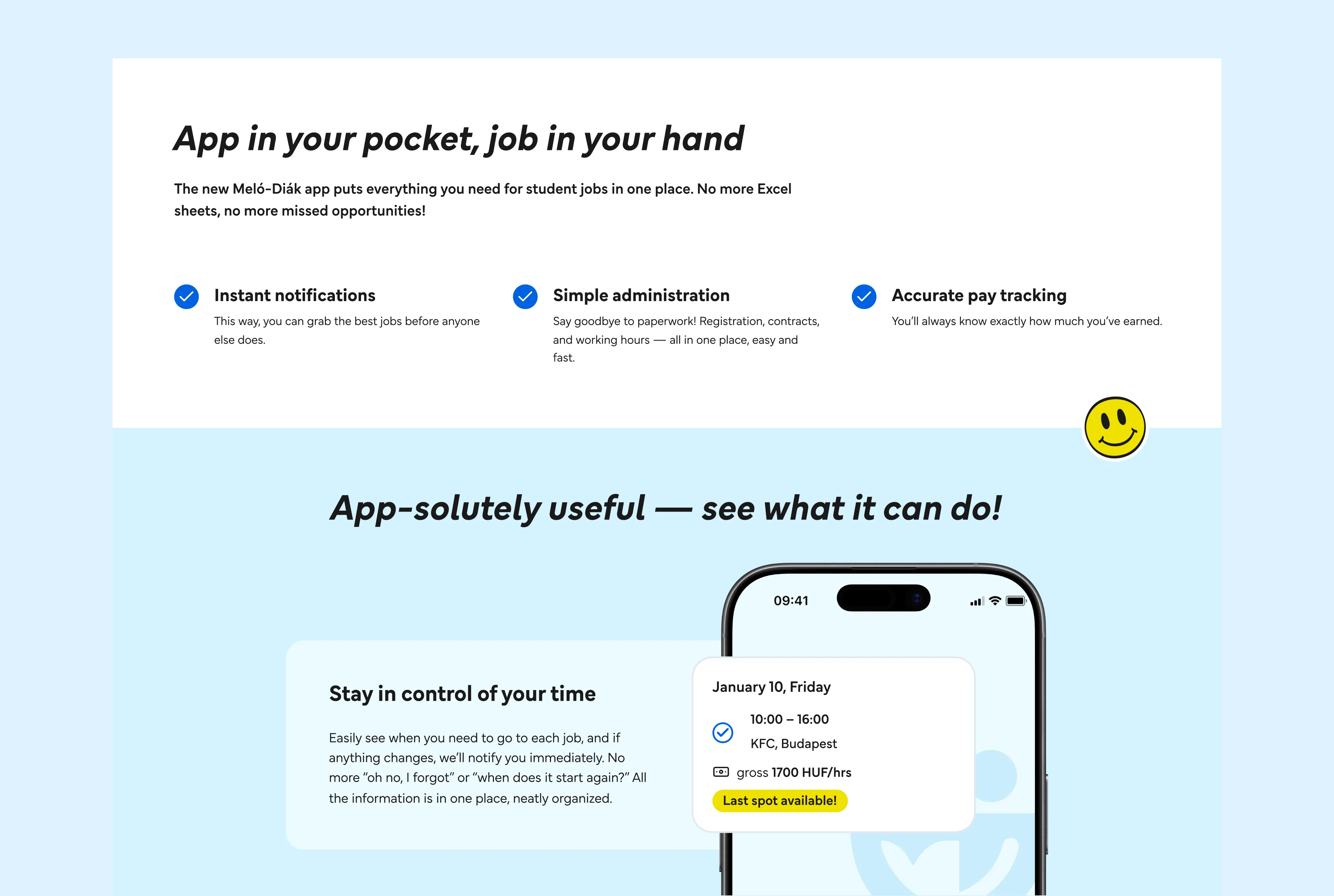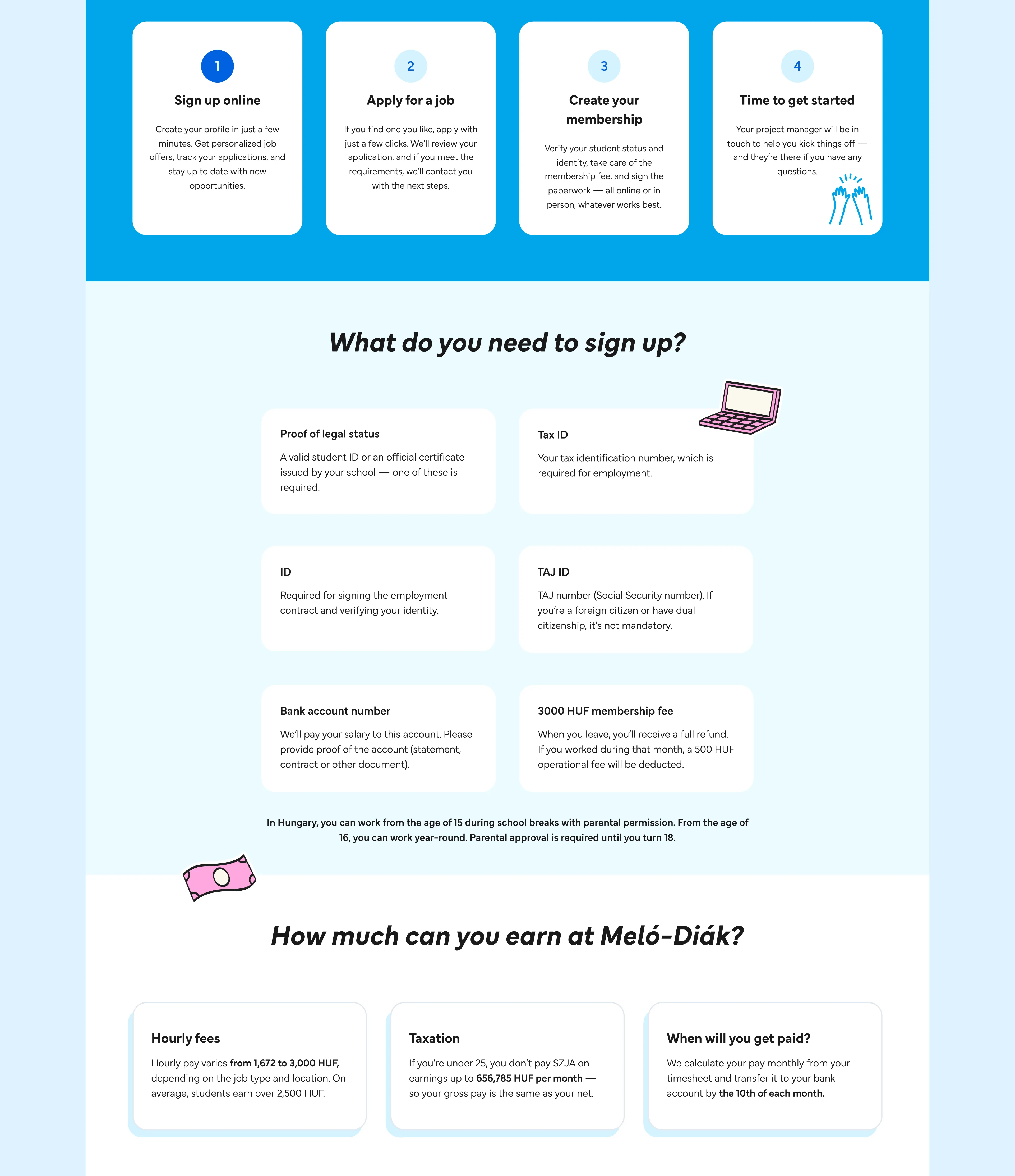 For students, they can learn about the steps how to work through Meló-Diák, what documents they need to create a membership, what types of jobs they can choose from and what the benefits are. I also designed a short page to showcase the mobile application.